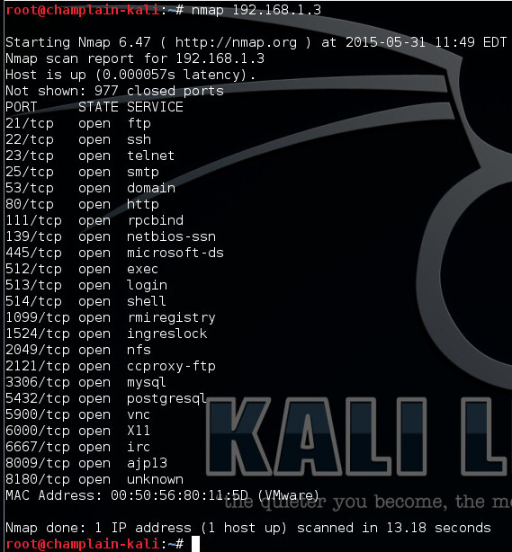 One of the first things that must be done is to identify the target machine. Running the “ifconfig” command via the Metasploitable command prompt as seen in figure 1 below does this. The targeted machine’s IP address is identified as 192.168.1.3, which is critical information for launching exploitations and attacks. In the real world (non-lab environment) this IP address would have been derived from any reconnaissance that was performed against the target network.
