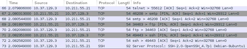 A TCP port scan sends hello packets to a specified number of ports as entered in the search. When a client returns an “RST, ACK” packet, it’s a clear indication that the port is closed as seen in figure 1 above. When the attacker receives an “ACK” packet from the attacked host, as seen in figure 2 below, this indicates that port is open to connections and vulnerable to exploitations. As a result of the scan, a number of vulnerabilities have been detected and various protocols were identified including, telnet, ftp, and ssh, as seen in figure 2 below, which are potential targets for an attacker.